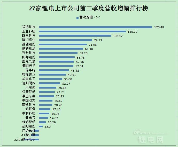 根據(jù)統(tǒng)計數(shù)據(jù)顯示,27家鋰電上市公司前三季度營收增長幅度平均為41.99%,增長幅度超過100%的共有3家,增長幅度超過50%的共有10家,實現(xiàn)營收增長的共有24家。