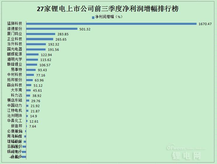 根據(jù)統(tǒng)計數(shù)據(jù)顯示,27家鋰電上市公司前三季度凈利潤增幅平均為138.99%,表現(xiàn)比營收增幅更出色,其中,實現(xiàn)增長超過100%的共有9家公司,實現(xiàn)正增長的共有21家公司,負增長的共有6家公司,凈利潤排行榜出現(xiàn)了兩極分化比較明顯的現(xiàn)象。