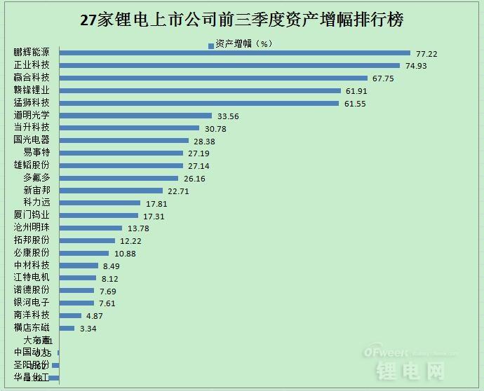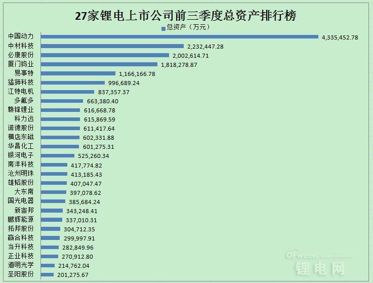 根據(jù)統(tǒng)計數(shù)據(jù)顯示,2017年鋰電產(chǎn)業(yè)發(fā)展態(tài)勢良好,前三季度鋰電公司的資產(chǎn)漲了不少,27家鋰電上市公司總資產(chǎn)均超過20億元,其中,有5家企業(yè)的總資產(chǎn)超過100億元,有14家企業(yè)資產(chǎn)超過50億元。