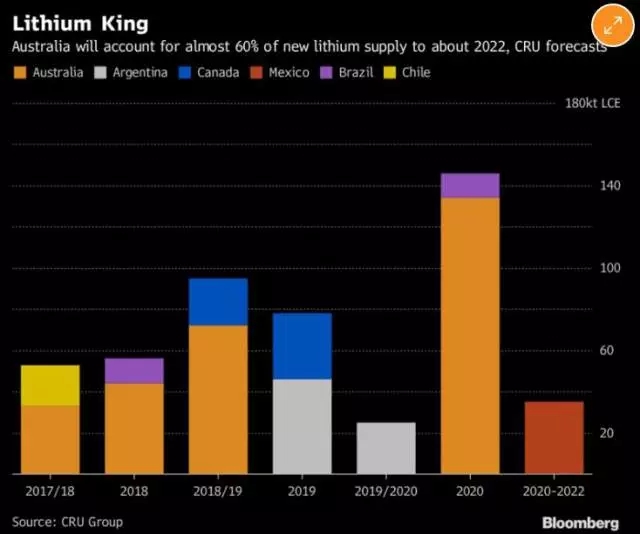 該分析圖顯示,到2020年全球新增產(chǎn)的鋰礦有60%出自澳大利亞。