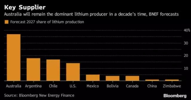 根據(jù)彭博社新能源金融的預測,從長期來看,即使全球有更多的地區(qū)將會加入鋰礦生產(chǎn)的大潮中,澳大利亞仍能保持市場主導地位。到2027年,澳大利亞將占有全球鋰礦產(chǎn)量的37%,阿根廷將占有全球鋰礦產(chǎn)量的18%。