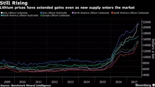 下圖是彭博社提供的鋰礦價格自2009年至今的走勢圖,顯示雖然有很多的鋰礦產(chǎn)能加入,但是全球鋰的價格自2015年開始就進入上升通道。