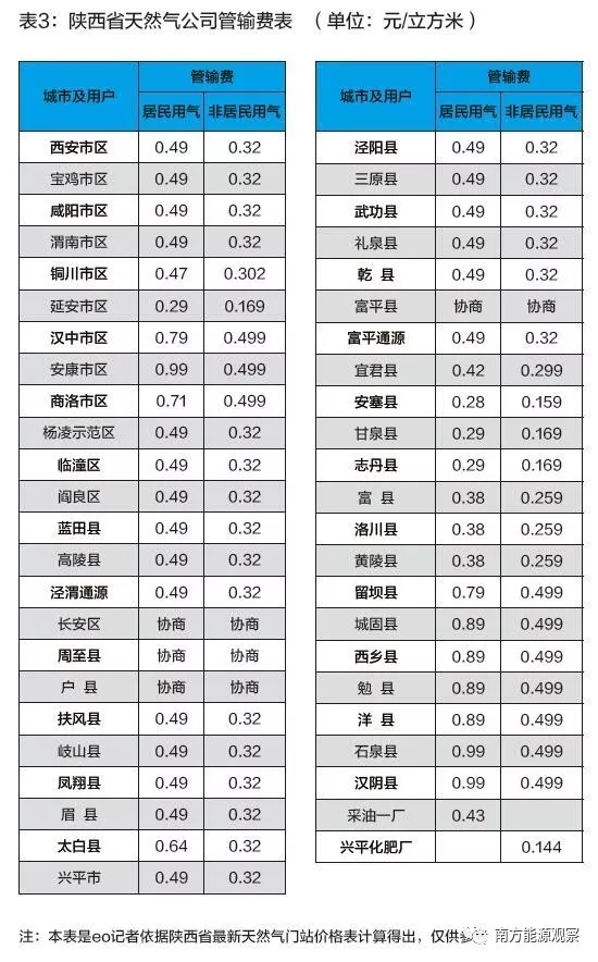 下調(diào)后全省管輸費(fèi)基本情況為:延安以北居民管輸費(fèi)為0.29元/立方米,非居民為0.169元/立方米;關(guān)中地區(qū)居民用氣管輸費(fèi)為0.49元/立方米,非居民用氣為0.32元/立方米;而陜南漢中、安康、商洛的居民用氣管輸費(fèi)分別為0.79元/立方米、0.99元/立方米和0.71元/立方米,非居民的管輸費(fèi)同為0.499元/立方米(詳見表3)