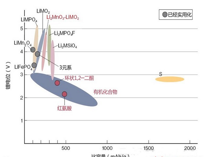 目前的鋰離子充電電池正極材料采用鈷酸鋰(LiCoO2)、3元系(LiNiMnCoO2)、錳酸鋰(LiMn2O4)、磷酸鐵鋰(LiFePO4)等(圖12)。不過,這些正極材料的理論容量都在200mAh/g以下。因此,探索容量在200mAh/g以上的新材料,以及為將最大性能提高到理論容量值而在正極材料中添加添加物的開發(fā)日益活躍。