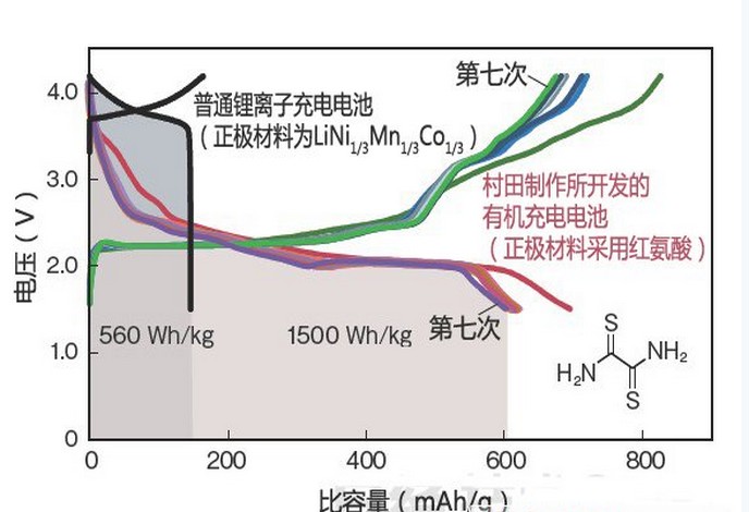 有機化合物與現(xiàn)行的材料相比可提高正極的比容量。村田制作所將紅氨酸定位為主要候補,已確認可將容量密度提高到650mAh/g左右。
