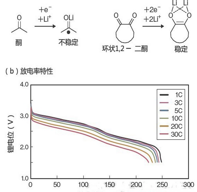 京都大學和松下開發(fā)出了正極材料采用將兩個酮連接形成環(huán)狀構(gòu)造的環(huán)狀1,2-二酮的有機充電電池(a)。支持30C的高速充放電(b)。