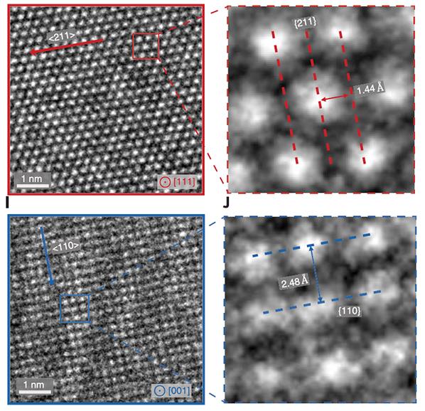 左圖:在室溫下的TEM圖像中,鋰的枝晶因暴露在空氣中而被腐蝕,電子束也在上面熔出大量孔洞;右圖:cryo-EM下的圖像,冷凍環(huán)境保存了其原來的狀態(tài),表明其有明確界面的晶體納米線。