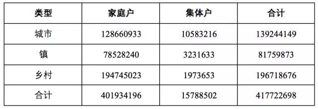 根據(jù)第六次全國人口普查,全國共有417,722,698戶頭,其中,家庭戶頭401,934,196個,集體戶頭15,788,502個。這其中,又分為城市、鎮(zhèn)、鄉(xiāng)村,具體如下表所示。
