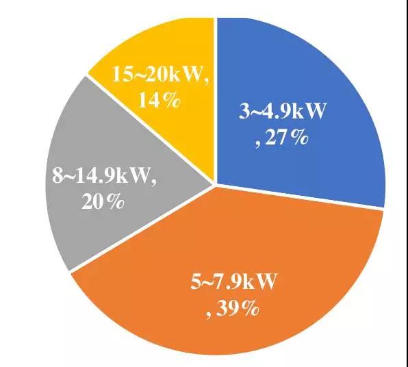 根據(jù)從我國幾家著名戶用逆變器廠家的發(fā)貨量數(shù)據(jù)來看,戶用項目的主要容量分布如下圖所示。使用的逆變器型號,基本可以代表戶用系統(tǒng)的安裝規(guī)模。