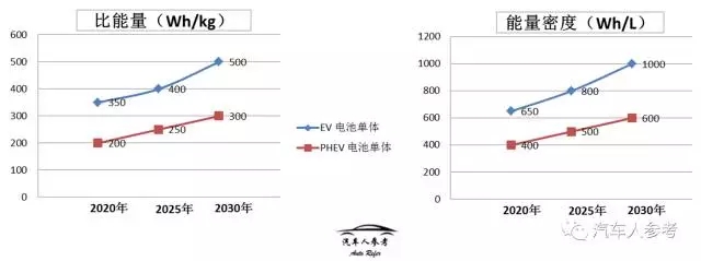 根據(jù)16年發(fā)布的“節(jié)能與新能源汽車技術(shù)路線圖”,我們可以大概對動(dòng)力電池發(fā)展趨勢有一個(gè)概念,下圖所示,到2020年,純電動(dòng)汽車電池單體比能量要達(dá)到350Wh/kg