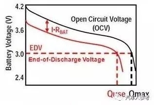 用數(shù)據(jù)說話,下圖表示一電池放電曲線,X軸表示放電量,Y軸表示電池開路電壓,電池理想放電狀態(tài)為黑色曲線,紅色曲線是考慮到電池內(nèi)阻時(shí)的真實(shí)狀態(tài)。