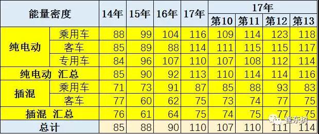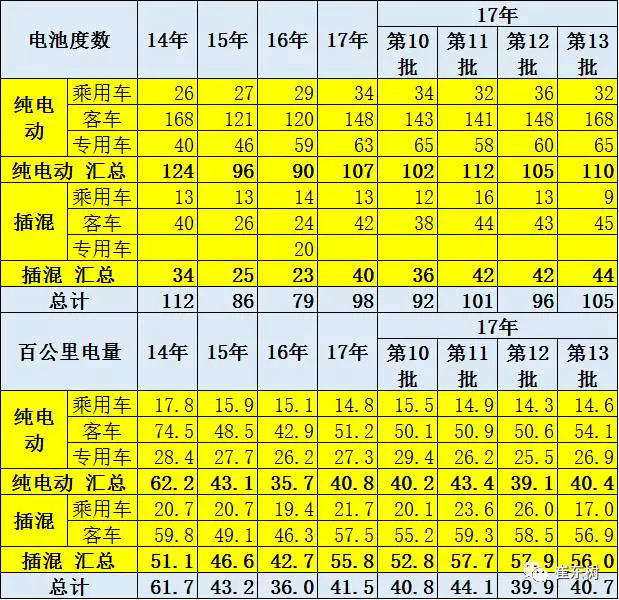 17年的第13批的新能源車的電池容量平均為105度比第12批的96度提升。這其中電動乘用車是34度,電動客車是148度,快充類的客車是77度左右。而插混客車車型是42度。