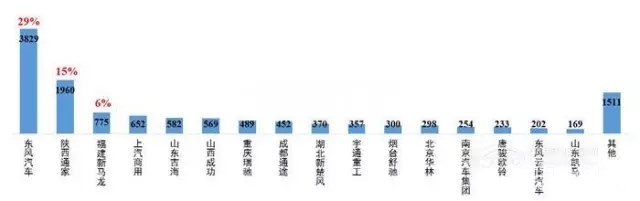 (3)分企業(yè)產(chǎn)量:2017年1-6月,新能源專用車生產(chǎn)企業(yè)達73家,其中近40%企業(yè)產(chǎn)量不足10輛。前10家企業(yè)新能源專用車產(chǎn)量占比為88%。其中,東風汽車公司產(chǎn)量占比29%,領先優(yōu)勢明顯。