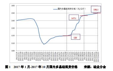 2017年9-10月份多晶硅價(jià)格持穩(wěn)微漲,從9月初的14.71萬(wàn)元/噸,上漲到10月底的15.01萬(wàn)元/噸,增幅僅有2.0%,相比7-8月份的價(jià)格漲幅21.9%增速有所放緩。10月份多晶硅均價(jià)14.95萬(wàn)元/噸,環(huán)比增加1.3%。