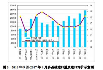 根據(jù)海關(guān)最新數(shù)據(jù)統(tǒng)計(jì),2017年9月份多晶硅進(jìn)口量為17628噸,環(huán)比增加9.2%,再創(chuàng)歷史新高。1-9月份累計(jì)進(jìn)口量120312噸,同比大幅增加16.2%。值得注意的有以下四點(diǎn):