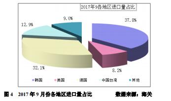 分國(guó)別來(lái)看:2017年9月份,自韓、德、美、臺(tái)這四個(gè)地區(qū)進(jìn)口量16040噸,占總進(jìn)口量的91.0%,進(jìn)口量占比分別為37.8%、32.1%、8.2%、12.9%,韓國(guó)進(jìn)口量仍居首位,德國(guó)、臺(tái)灣、馬來(lái)西亞進(jìn)口量均創(chuàng)新高。分貿(mào)易方式來(lái)看:2017年9月份按加工貿(mào)易方式進(jìn)口多晶硅占比12.3%,其中按保稅區(qū)倉(cāng)儲(chǔ)轉(zhuǎn)口方式進(jìn)口占比達(dá)到83.5%。