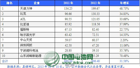 2012年中國鋰離子電池電芯企業(yè)前10強(以產(chǎn)銷量計) 單位:萬kWh
