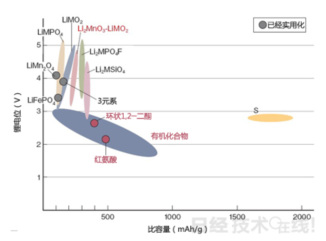 從圖1可以看到,理論能量密度比OLO更高的正極材料還有很多,如Li2MPO4F、LiMSiO4、有機(jī)化合物等,特別是有機(jī)化合物,理論容量最大可達(dá)到近1,000mAh/g。而且不使用重金屬。因此具備重量輕,資源限制少的優(yōu)勢。不過,有機(jī)化合物正極材料的理論能量密度雖然很高,但是鋰電位卻比較低,大多只有2~3.5V。因此,要想實現(xiàn)與目前的鋰離子電池相同的能量密度,至少要找到具備400~600mAh/g容量的有機(jī)化合物。目前也有很多日本企業(yè)在這方面努力,其中就包括松下、本田、村田制作所(Murata,電子零件專業(yè)制造商,已深入鋰電領(lǐng)域)等知名企業(yè)。