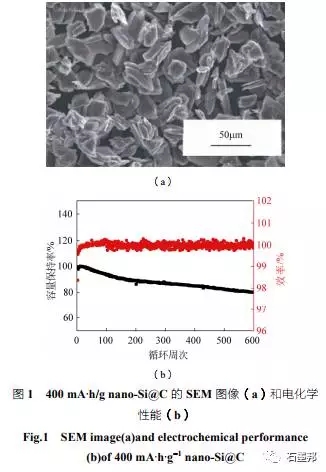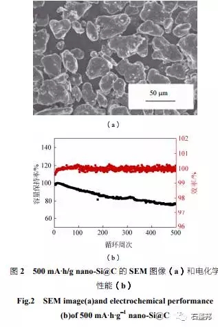 在氧化亞硅碳復(fù)合材料方面,已經(jīng)有較為成熟的軟碳包覆工藝,在固相條件下對(duì)原材料表面進(jìn)行高溫?zé)崽幚?,可以有效提高材料首效、增加?dǎo)電性、緩解膨脹。目前,項(xiàng)目組已經(jīng)可以制備批次穩(wěn)定性較高的碳包覆氧化亞硅材料,并且在合作單位取得了較好的測(cè)試結(jié)果反饋。如420 mA·h/g 的碳包覆氧 化亞硅材料,匹配正極鋰鎳錳酸鋁(NCA),制備成3A·h規(guī)格為20650的鋼殼電池,在1C充電、 10C放電的測(cè)試條件下,循環(huán)500 周容量保持80% (圖3)。