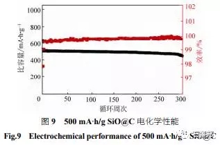在氧化亞硅碳復(fù)合材料方面,項(xiàng)目組主要通過控制氧含量以及與第二相復(fù)合對(duì)氧化亞硅的電化學(xué)性能進(jìn)行優(yōu)化。其中,對(duì)氧化亞硅中硅晶粒的調(diào)控取得了進(jìn)展并在表面電荷作用下制備出表界面穩(wěn)定的高容量氧化亞硅碳負(fù)極材料,有效地提高了氧化亞硅的首次及后續(xù)庫侖效率,改善了其循環(huán)穩(wěn)定性。為進(jìn)一步改善電極材料的高壓實(shí)條件下的性能,項(xiàng)目組采用包覆工藝,并通過對(duì)材料復(fù)合過程的控制,也取得了較大進(jìn)展。比容量500 mA·h/g 在1C充放條件下其電化學(xué)性能如圖9所示。