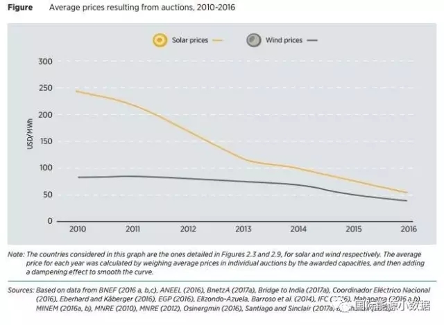 中國(guó)儲(chǔ)能網(wǎng)訊:根據(jù)國(guó)際可再生能源署最新發(fā)布的《可再生能源競(jìng)價(jià)分析報(bào)告》,到2016年中已經(jīng)至少有67個(gè)國(guó)家以競(jìng)價(jià)方式確定可再生能源項(xiàng)目,而2010年時(shí)只有10個(gè)國(guó)家實(shí)行可再生能源項(xiàng)目競(jìng)價(jià)。相比固定的標(biāo)桿價(jià)格,可再生能源競(jìng)價(jià)有效地降低了可再生能源上網(wǎng)的價(jià)格。2010年,風(fēng)電合同平均價(jià)格為80美元/兆瓦時(shí)、光伏為250美元/兆瓦時(shí);而2016年風(fēng)電平均合同價(jià)下降37.5%,為40美元/兆瓦時(shí),光伏下降幅度更達(dá)到80%,為50美元/兆瓦時(shí)(相當(dāng)于人民幣0.33元/千瓦時(shí))。