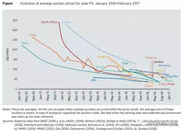 然而,雖然各國(guó)可再生能源價(jià)格均呈下降的趨勢(shì),但是各國(guó)之間仍有較大差別。以光伏為例(見(jiàn)下圖),阿布扎比、墨西哥、迪拜、印度、阿根廷、美國(guó)的光伏價(jià)格都處于國(guó)際上最低梯隊(duì),而中國(guó)、德國(guó)等國(guó)光伏價(jià)格則處于相對(duì)較高的水平。國(guó)際可再生能源署報(bào)告在評(píng)論到中國(guó)的光伏價(jià)格時(shí)用了一個(gè)這樣的形容詞:surprising(令人驚訝)!