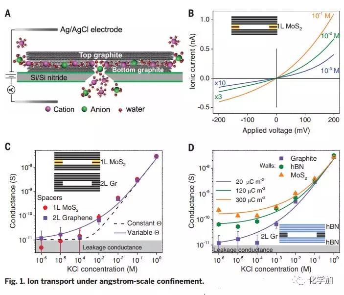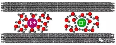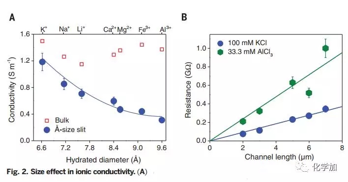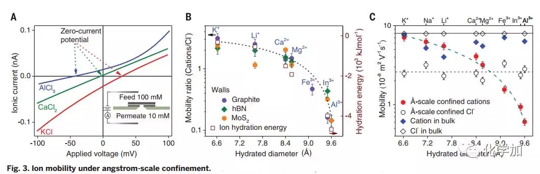 來自英國、中國的科研團隊通過調(diào)控分子間范德華作用力,組裝得到具有原子級別光滑表面的石墨烯通道,僅兩層石墨烯厚度不同于準(zhǔn)一維納米管和生物通道,這種二維納米通道化學(xué)穩(wěn)定性良好,其高度潔凈表面使得通道表面電荷密度較此前文獻報道值低3-4個數(shù)量級,可以阻隔水合直徑>13 ?的離子,這可以通過位阻效應(yīng)予以解釋。