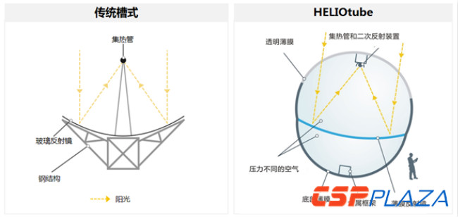 圖:傳統(tǒng)槽式集熱器與HELIOtube的工作原理示意圖