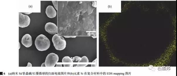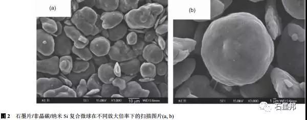 Kim等首先將煤瀝青溶解在四氫呋喃里面, 然后加入納米Si粉和石墨微球;超聲分散均勻后,蒸發(fā)出四氫呋喃獲得前驅(qū)混合物,其中Si和石墨的比例可以通過添加原料來控制.在Ar氣氛中煅燒1000℃后, 瀝青熱解出的非晶碳將納米Si緊密地“粘”在石墨微球的表面, 如圖6所示,所得最終產(chǎn)物為“土豆?fàn)睢鳖w粒, 納米Si均勻地復(fù)合在石墨球外層.