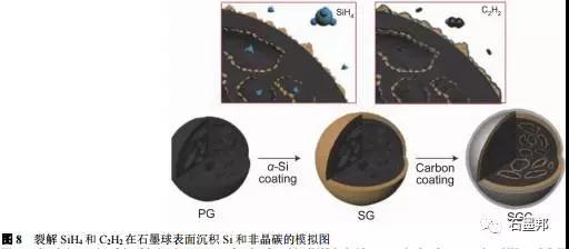 化學(xué)氣相沉積法,主要是以石墨為基底,通過高溫裂解硅烷在石墨表面沉積Si獲得復(fù)合材料.氣相沉積的最大優(yōu)勢是可以保證納米Si均勻地分布在石墨的表面.
