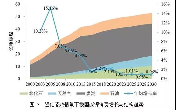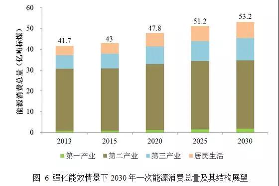 綜上分析,我國2020年一次能源消費(fèi)總量約48億噸標(biāo)煤,2030年一次能源消費(fèi)總量可控制在53億噸標(biāo)煤左右(圖6)。這也就表明,能效情景是具備較大可行性的。