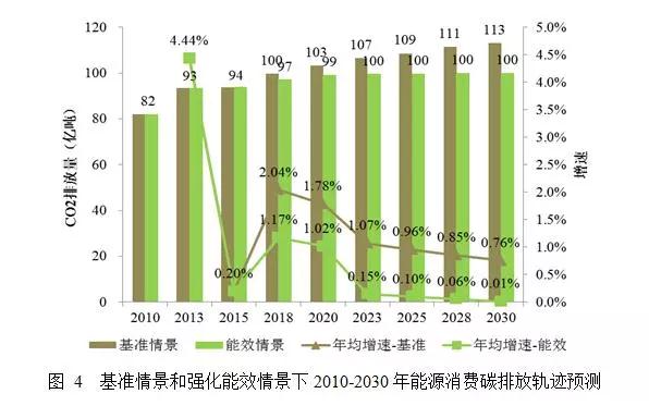 基準(zhǔn)情景中,我國能源消費(fèi)二氧化碳排放量一直處于增長態(tài)勢,“十三五”期間,能源消費(fèi)二氧化碳排放量凈增長約9億噸,2020-2030年凈增長約10億噸,從二氧化碳排放量的年均增速來看,“十三五”期間,年均增速接近2%,2020年之后二氧化碳排放量年均增速約0.92%。能效情景中,我國能源消費(fèi)二氧化碳排放量增長速度明顯小于基準(zhǔn)情景,尤其是2023年以后,二氧化碳排放量幾乎接近零增長,年均增長率可在0.1%左右。從絕對量上來看,能效情景中二氧化碳排放量要顯著少于基準(zhǔn)情景,2020年減排放4億噸,2030年減排13億噸,能夠更好地履行2030年二氧化碳排放總量盡早達(dá)峰的目標(biāo)(圖4)。