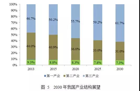 那么,能效情景僅是一個(gè)情景描述嗎?有沒有潛在可達(dá)性?為了回答這個(gè)問題,本文進(jìn)一步研究了我國經(jīng)濟(jì)結(jié)構(gòu)調(diào)整的趨勢以及各產(chǎn)業(yè)能源消費(fèi)強(qiáng)度下降的潛力。首先,,基于歷史數(shù)據(jù)以及已有研究成果對我國2030年產(chǎn)業(yè)結(jié)構(gòu)的優(yōu)化情況進(jìn)行了展望(見圖5)。預(yù)計(jì)到2030年,我國第二產(chǎn)業(yè)占GDP的比重將下降到31%左右,而第三產(chǎn)業(yè)的比重將逐步上升到61.7%左右。