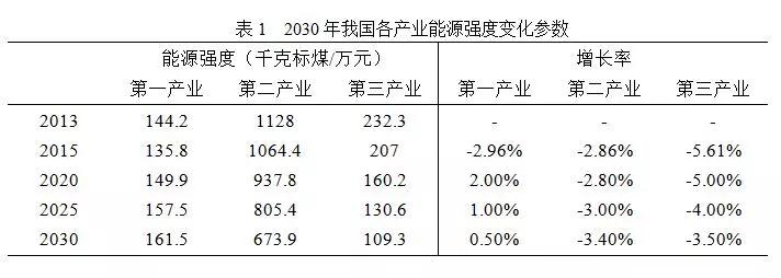 在此基礎(chǔ)上,本文設(shè)計(jì)了到2030年各產(chǎn)業(yè)能源強(qiáng)度的變化路徑(表1)??傮w來講,現(xiàn)代農(nóng)業(yè)的發(fā)展將消耗更多的能源,也就意味著第一產(chǎn)業(yè)的能源強(qiáng)度水平將有小幅上升;內(nèi)部結(jié)構(gòu)優(yōu)化與技術(shù)提升將導(dǎo)致第二產(chǎn)業(yè)未來的能源強(qiáng)度保持持續(xù)下降趨勢;而第三產(chǎn)業(yè)能源強(qiáng)度在歷史趨勢上減速下降。