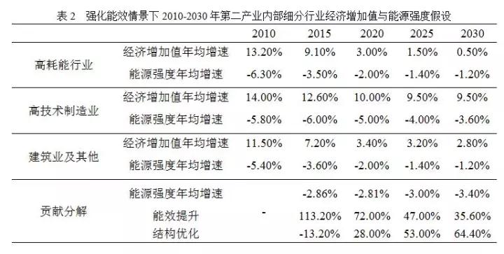 首先,根據(jù)歷史發(fā)展數(shù)據(jù)對三類行業(yè)經(jīng)濟(jì)增加值的變化趨勢進(jìn)行初步判斷與參數(shù)設(shè)定,進(jìn)而得到2030年第二產(chǎn)業(yè)內(nèi)部結(jié)構(gòu)的變化趨勢。對于三類行業(yè)能源強(qiáng)度的下降趨勢基于以下判斷:高耗能行業(yè)與建筑業(yè)及其他行業(yè)的生產(chǎn)技術(shù)相對成熟,能效改善空間不大,能效改進(jìn)空間主要關(guān)注的是高技術(shù)制造業(yè)?;谝陨霞僭O(shè)及判斷,本文對三類行業(yè)的經(jīng)濟(jì)增加值與能源強(qiáng)度的變化趨勢分別進(jìn)行了參數(shù)設(shè)定(如表2)。結(jié)果顯示,“十三五”期間,第二產(chǎn)業(yè)能源強(qiáng)度年均下降2.81%,其中有72%的貢獻(xiàn)源自技術(shù)進(jìn)步。但是2020到2030年間,第二產(chǎn)業(yè)能源強(qiáng)度的主要驅(qū)動(dòng)力是結(jié)構(gòu)優(yōu)化,貢獻(xiàn)率超過60%。