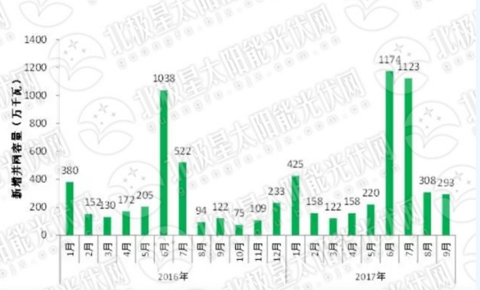 按這個(gè)口徑我們進(jìn)行了一下統(tǒng)計(jì),上圖是今年和去年1—9月份我們光伏新增裝機(jī)的一個(gè)逐月數(shù)據(jù)圖,大家看到6月份,因?yàn)椤?30”政策的影響,出現(xiàn)了一個(gè)搶裝的高峰。但是今年的特點(diǎn)是“630”之后,到了7月份當(dāng)月新增的規(guī)模仍然超過了1000萬千瓦,8月份、9月份有所下降,,雖然8月、9月凈增的大概是300萬千瓦左右的規(guī)模,但是新增光伏中分布式光伏占比大概超過1/3。
