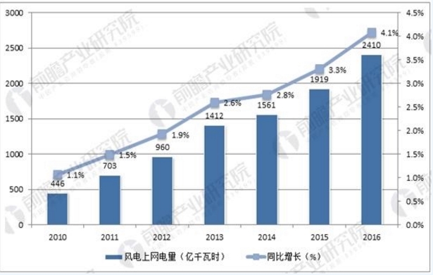 中國(guó)風(fēng)電上網(wǎng)電量占總發(fā)電量比例逐年增加,2016年風(fēng)電上網(wǎng)電量為2410億千瓦時(shí),占總發(fā)電量的比重達(dá)4.08%, 超越核電(3.56%)和光伏(1.12%)成為我國(guó)第一大新能源發(fā)電形式。隨著國(guó)家能源局一些列消納措施的落地,風(fēng)電上網(wǎng)電量逐漸攀升,棄風(fēng)限電有望逐步緩解,行業(yè)逐步轉(zhuǎn)向市場(chǎng)化。