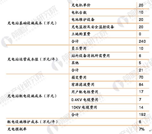 充電站成本分為三大部分:基礎(chǔ)設(shè)施成本、配電設(shè)施成本、運(yùn)營(yíng)成本。目前很多充電站均是由省網(wǎng)公司和當(dāng)?shù)卣?lián)合建設(shè),很多用地均為政府劃撥,土地購(gòu)臵費(fèi)較低,在對(duì)充電站基礎(chǔ)設(shè)施成本的判斷中,假設(shè)土地購(gòu)置費(fèi)用為0。
