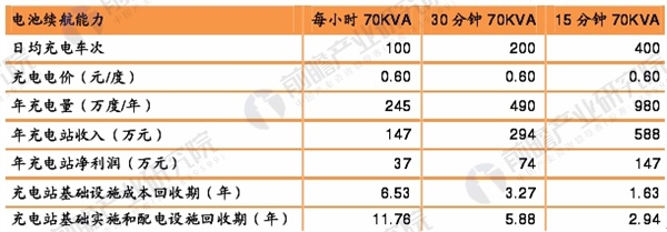 總體來(lái)看,單個(gè)充電站基礎(chǔ)設(shè)施和配電設(shè)施投資額不算大,如果電池續(xù)航能力能夠達(dá)到半小時(shí)70KVA以上,充電站成本回收期能控制在6年以?xún)?nèi),單個(gè)充電站基礎(chǔ)設(shè)施和配電設(shè)施投資在430萬(wàn)元左右。
