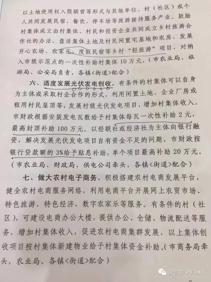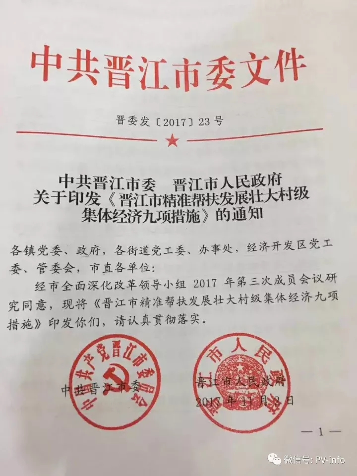 中國儲能網(wǎng)訊:2017年11月2日晉江市委市政府聯(lián)合發(fā)布《晉江市精準幫扶發(fā)展壯大村級集體經(jīng)濟九項措施》的文件,對晉江市光伏發(fā)電實行補助,村級光伏項目一次性補助2元/瓦,對于貸款部分,市級財政給予3%的貼息補助,相當?shù)耐梁?,值得我們其他政府學習!