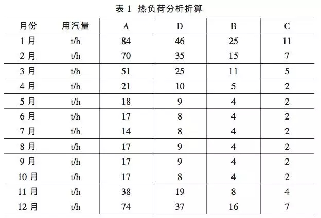 考慮汽水換熱站側換熱系數(shù)和管道供熱系數(shù)均為 0.95,并依據(jù)《城鎮(zhèn)供熱管網(wǎng)設計規(guī)范》(CJJ 34-2010),考慮 5%的蒸汽管網(wǎng)損失和焓降后,折算到抽凝機抽汽參數(shù)為:P= 0.8MPa·a;t=290.4°C,背壓機供熱參數(shù)為 0.8MPa、280°C,各用戶熱負荷折算后各月的用汽量如表 1。
