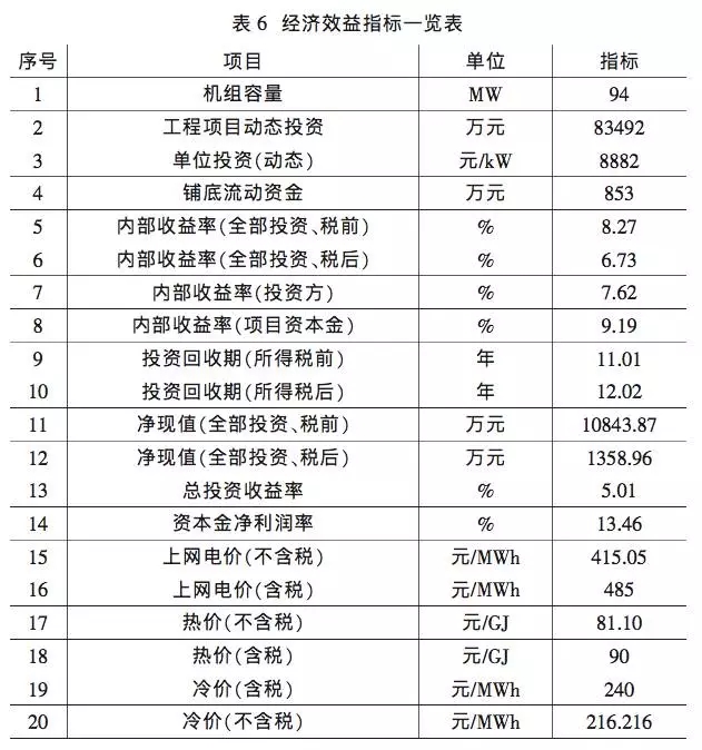 本項目是在保證企業(yè)成本費用、稅金、盈余公積金、企業(yè) 用于還貸的利潤、機組投產后 10 年內還清貸款,還款采用本金等額償還方式,按固定冷熱價與電價正算收益和經濟效益分析。 財務內部收益率、凈現(xiàn)值等指標見表 6 經濟效益指標一 覽表。