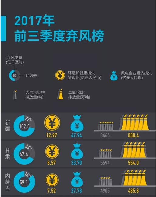 綜觀2017年前三季度數(shù)據(jù),新疆、甘肅和內(nèi)蒙古是棄風(fēng)量最高的三個(gè)省區(qū),占全國(guó)棄風(fēng)總量的77%。其中,甘肅和新疆的棄風(fēng)率分別為33%和29.3%,列居全國(guó)前兩名。綠色和平根據(jù)官方發(fā)布的火電排放數(shù)據(jù)和風(fēng)電價(jià)格計(jì)算,這三個(gè)省區(qū)前三季度由于棄風(fēng)造成的環(huán)境和健康損失估計(jì)為29億人民幣左右,碳排放約1878萬(wàn)噸,風(fēng)電企業(yè)經(jīng)濟(jì)損失約109億元人民幣。
