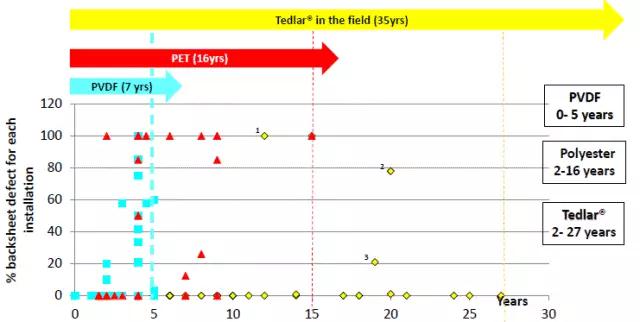 杜邦還對(duì)不同材料類型的背板及使用年限進(jìn)行了分析,結(jié)果顯示,基于Tedlar? PVF薄膜的背板是所有電站中使用最久、失效率最低的背板,而基于PVDF薄膜和PET的背板失效率較高,平均超過7%,且會(huì)隨著使用時(shí)間的增加而增加。