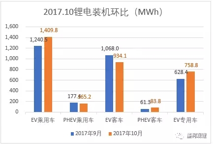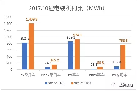 真鋰研究的數(shù)據(jù)顯示,2017年10月鋰電裝機(jī)3.35GWh,同比大增77.25%(去年同期1.89GWh),繼續(xù)保持著良好的發(fā)展勢頭。從具體各類車輛市場來看,純電動(dòng)乘用車依然是電池裝機(jī)最大的細(xì)分市場,10月裝機(jī)1.41GWh,同比大增70.64%。純電動(dòng)客車市場實(shí)現(xiàn)裝機(jī)0.93GWh,同比增長8.71%。數(shù)據(jù)再次印證中國車載電池市場的發(fā)展軌道已由純電動(dòng)客車向純電動(dòng)乘用車成功切換。