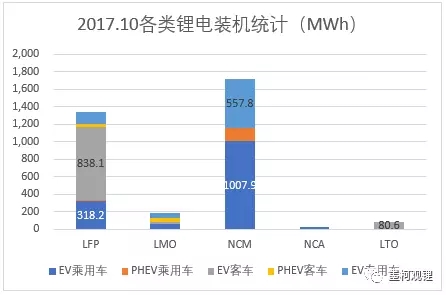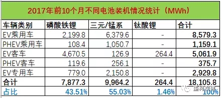 從各類電池情況來看,在前10個(gè)月18.1GWh鋰電總裝機(jī)量中,三元/錳系電池以9.96GWh占比55.03%,與前9個(gè)月的54.49%相比,又有一定提升,其中錳酸鋰電池不到0.9GWh。磷酸鐵鋰電池以7.88GWh占比43.51%,與前9個(gè)月的44.27%相比,有所下滑。鈦酸鋰電池前10個(gè)月累計(jì)裝機(jī)264.4MWh,占比只有1.46%。
