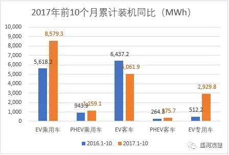 2017年前10個(gè)月中國新能源汽車市場鋰離子電池裝機(jī)總量為18.1GWh,同比增長31.43%(去年同期13.78GWh)。其中,純電動(dòng)乘用車裝機(jī)8.58GWh,占比47.38%,是最大的細(xì)分市場(不過,低于前9個(gè)月的48.59%);同比增長52.71%,也顯著領(lǐng)先于其他幾類車輛市場。純電動(dòng)客車市場鋰電裝機(jī)5.06GWh,占比27.96%,是第二大細(xì)分市場(和前9個(gè)月的27.98%基本相當(dāng));同比下降21.36%,與前9個(gè)月累計(jì)裝機(jī)同比下滑26%相比,情況有一定好轉(zhuǎn)。純電動(dòng)專用車市場鋰電裝機(jī)2.93GWh,占比16.18%。具體情況見下圖: