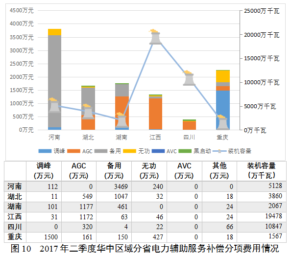 華中區(qū)域的河南、湖北以備用補(bǔ)償為主,重慶以調(diào)峰為主,其他省市以AGC補(bǔ)償為主。河南受負(fù)荷增長(zhǎng)放緩、煤價(jià)走高,以及外來(lái)電等多方面的影響,采取了機(jī)組輪停冷備的方式實(shí)現(xiàn)調(diào)峰,體現(xiàn)在備用補(bǔ)償費(fèi)中。重慶負(fù)荷峰谷差明顯,又作為四川水電的落地點(diǎn)之一,本地電源調(diào)峰壓力較大,補(bǔ)償力度也明顯高于區(qū)域內(nèi)其他省份(見(jiàn)圖10)。