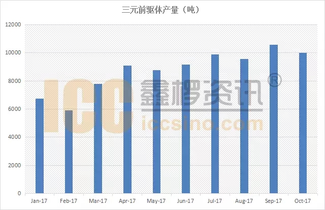 在正極材料市場,2017年是標準的“三元年”,市場的認可度及需求量都在穩(wěn)步的增加。受此帶動,三元前驅(qū)體市場也是供不應求,增長迅速。根據(jù)鑫欏資訊統(tǒng)計,2016年三元前驅(qū)體生產(chǎn)量約6.67萬噸,而2017年這一數(shù)字將突破10萬噸:截止到10月份,累計產(chǎn)量已達到8.7萬噸。