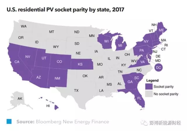 2017年,享受“電網(wǎng)平價(jià)”的美國(guó)家庭在全美家庭數(shù)中的比例